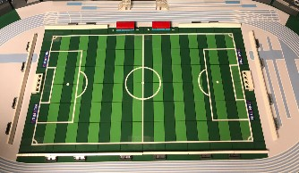 Il prato, che comprende anche le panchine sottoposte, misura 33,5 per 66 cm ed è realizzato da sei strati di mattoncini, rivestito con una stampa su vinile per rendere più realistico il risultato.