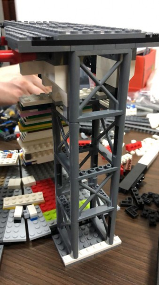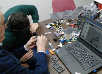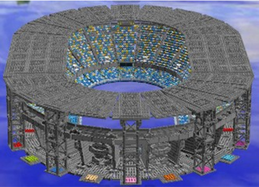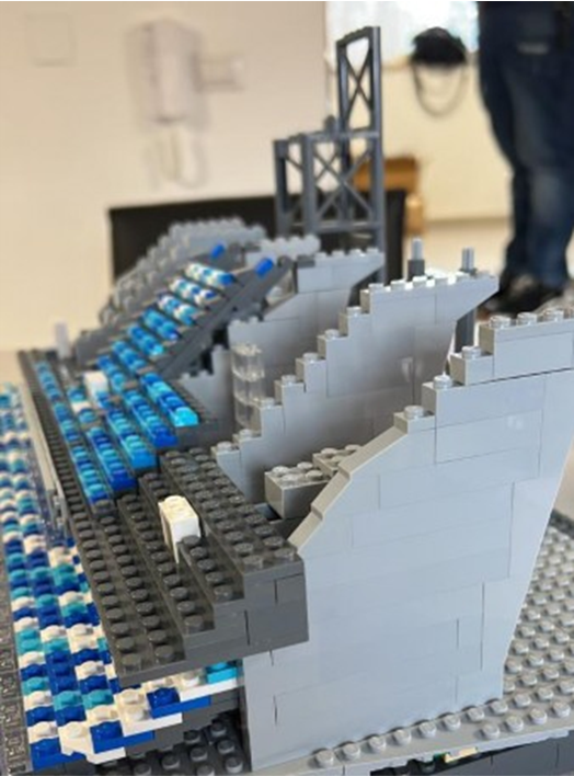 La grande sfida è stata trovare una tecnica costruttiva per la forma ovale e le coperture aggettanti, già di per sé complesse da realizzare in mattoncini, e che allo stesso tempo fosse sufficientemente solida per gli spostamenti. Grazie alla collaborazione di tutti si è arrivati alla soluzione di suddividere la struttura in cinque sezioni, fondate su una solida base che consente anche lo scorrimento del rettangolo che rappresenta il campo di gioco.